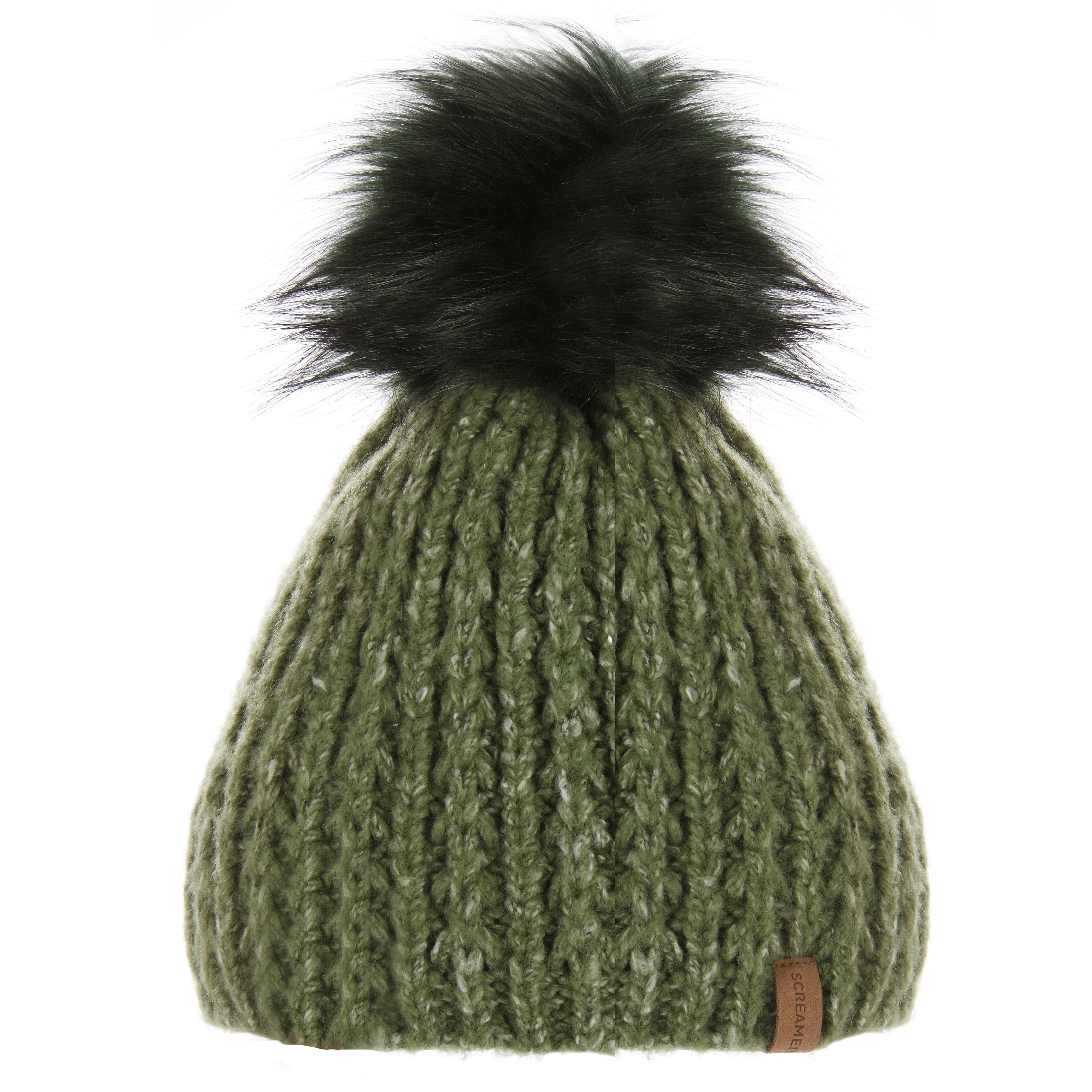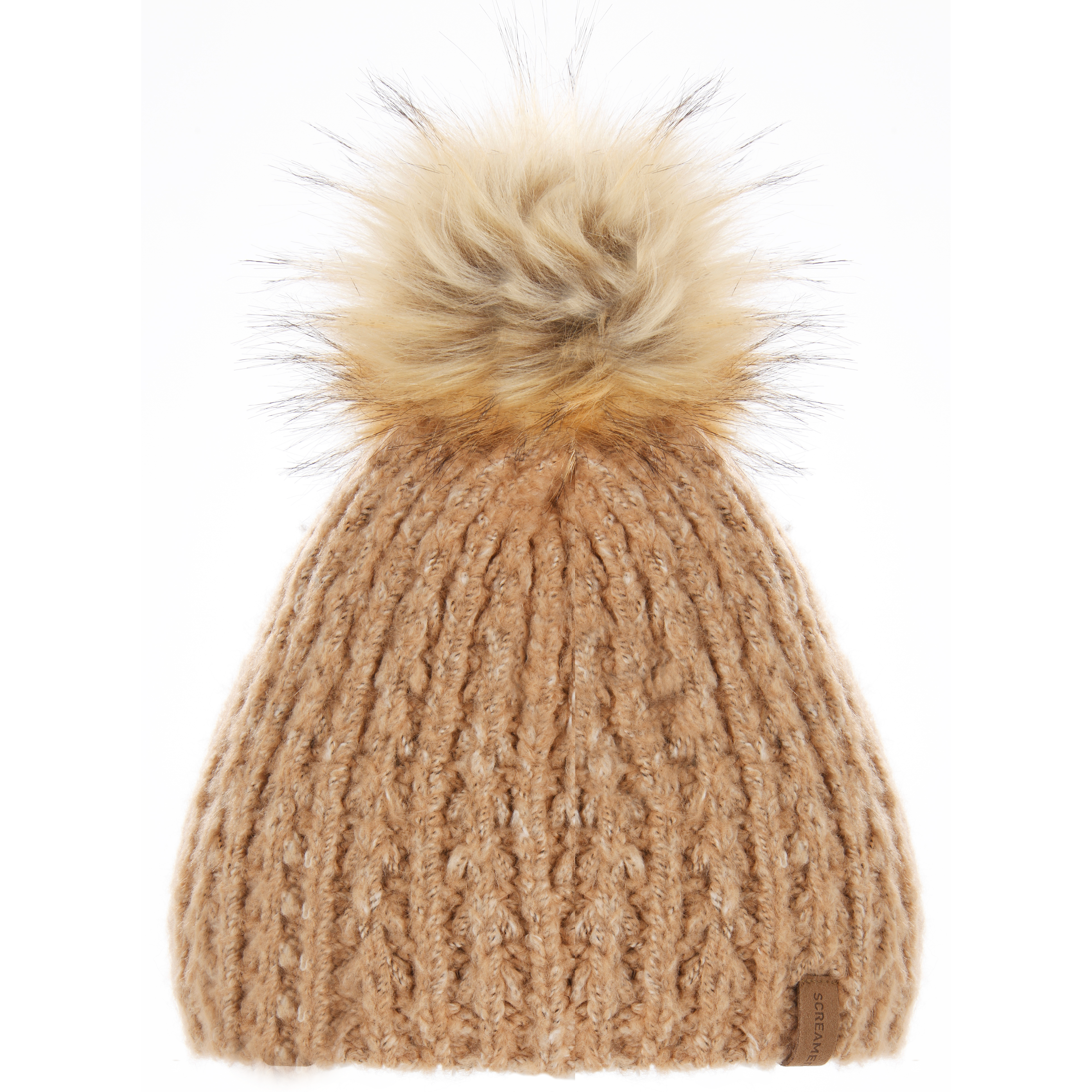 Traditional beanie in soft yarns of acrylic and polyester. A hint of cotton comes through in specks of white and spandex adds stretch to the design. This style has an extra element of softness with a fluffy fleece pile band lining. Each colorway comes with a coordinating faux fur pom.